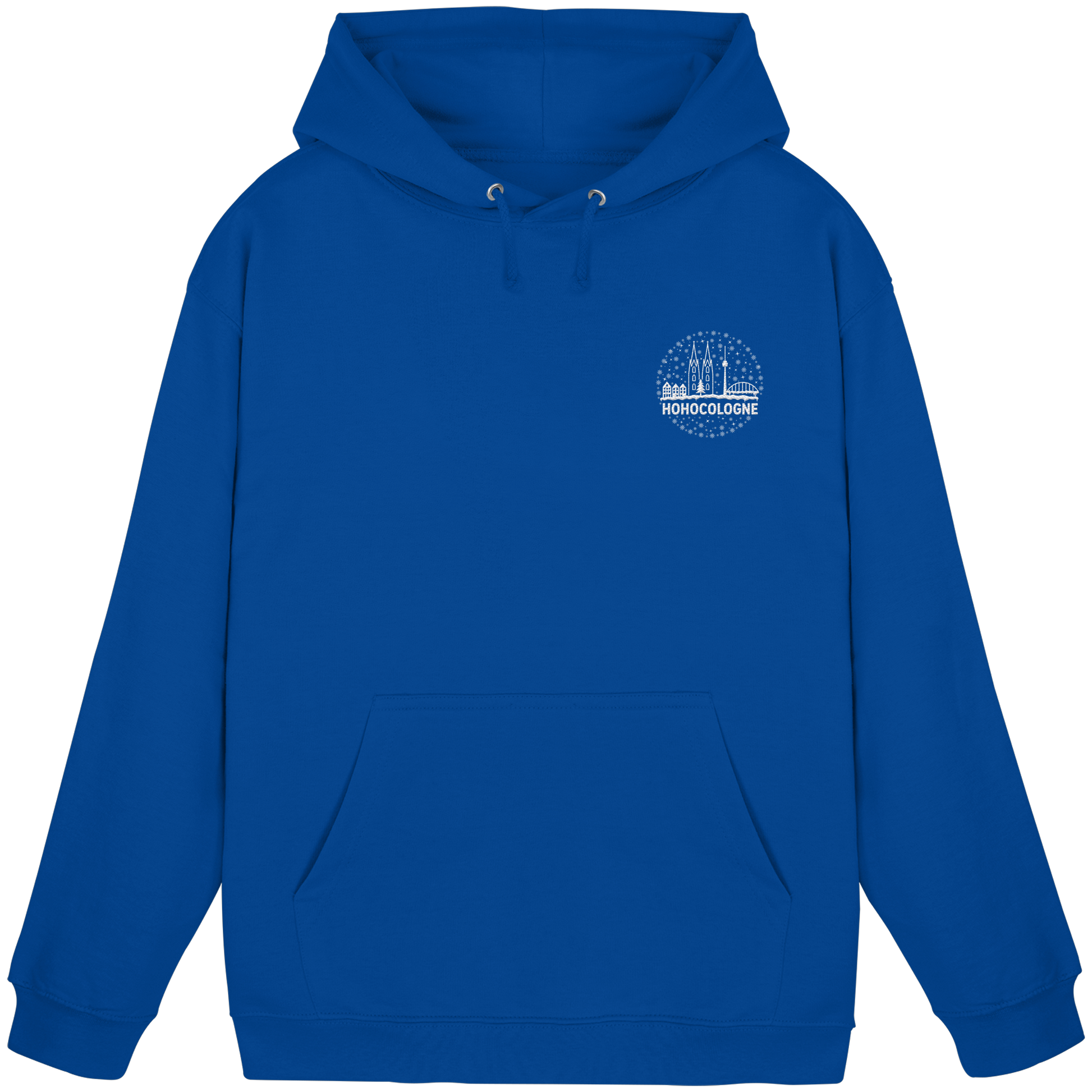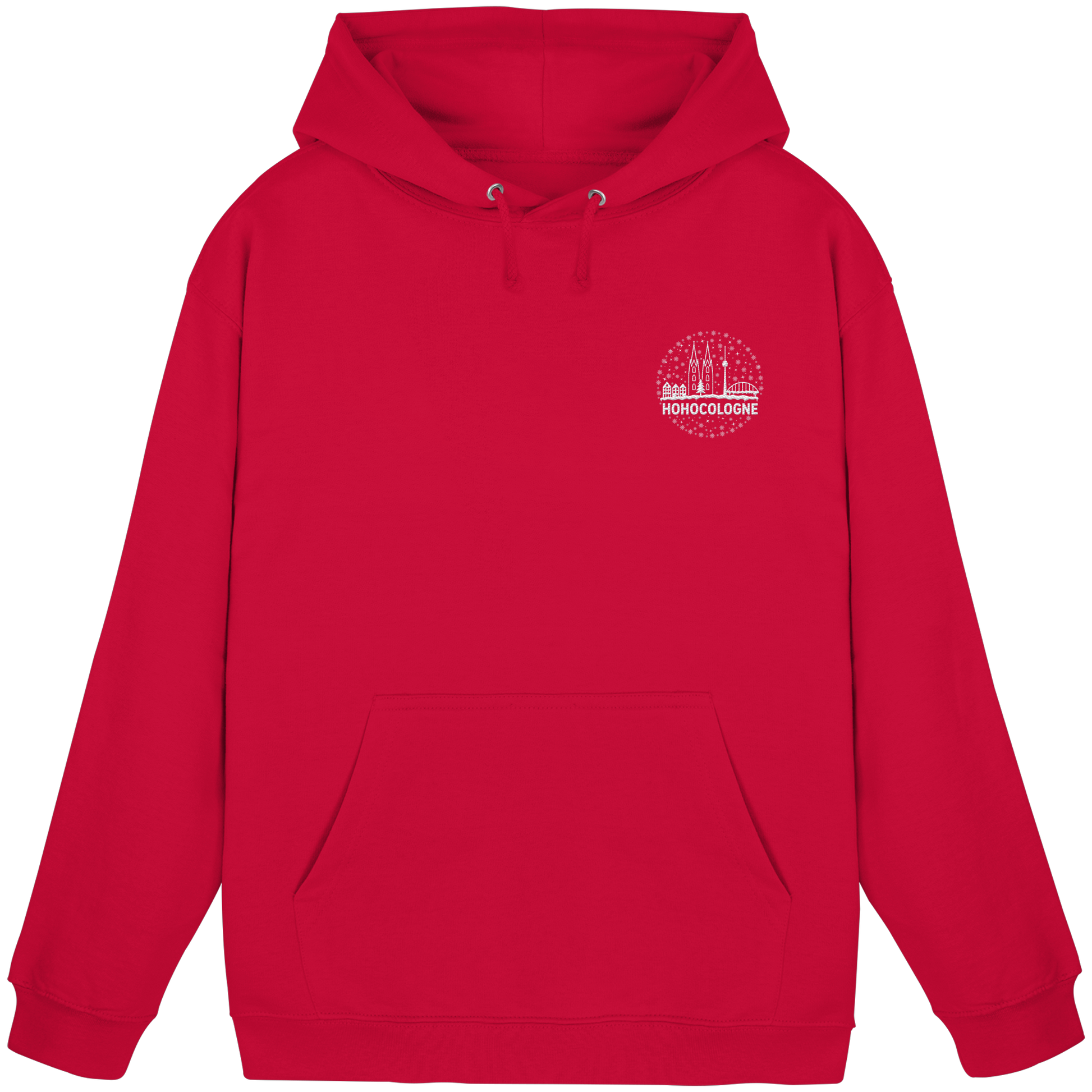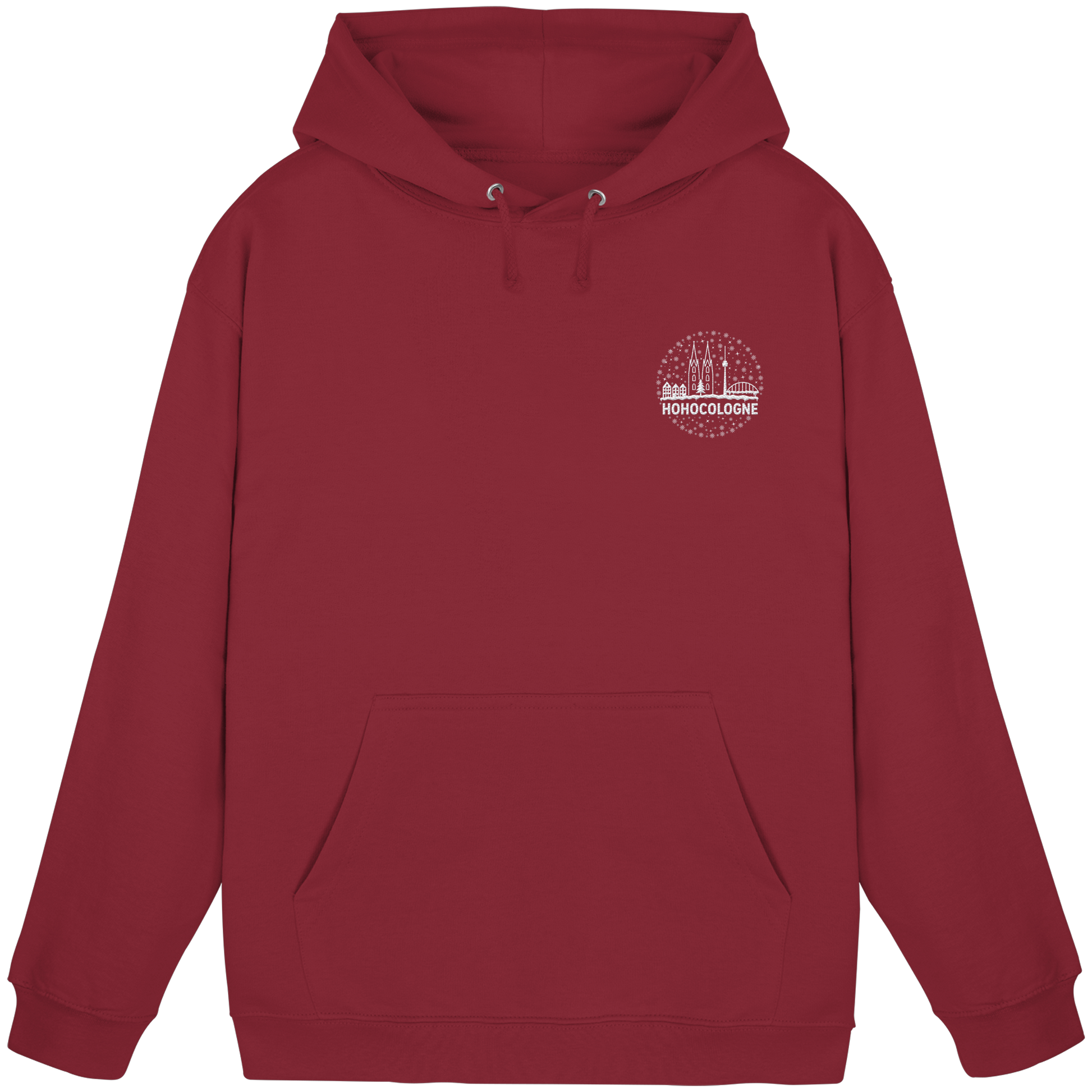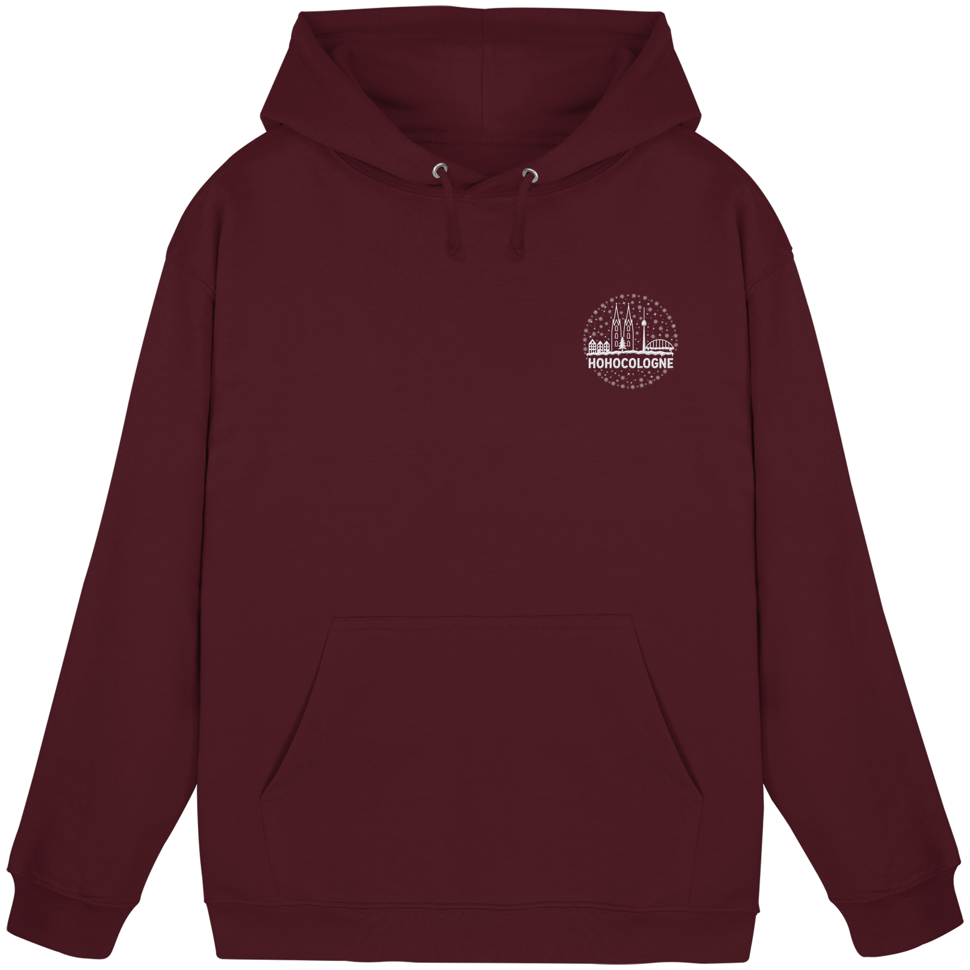 Das aufwendig weiß gestickte Motiv zeigt die Kölner Skyline mit Dom, Brücke und Fernsehturm – dazu Schneeflocken, ein Weihnachtsbaum und der Schriftzug HoHoCologne. Dezent festlich, klar im Design und typisch kölsch. Der Hoodie ist hochwertig verarbeitet und sitzt angenehm.