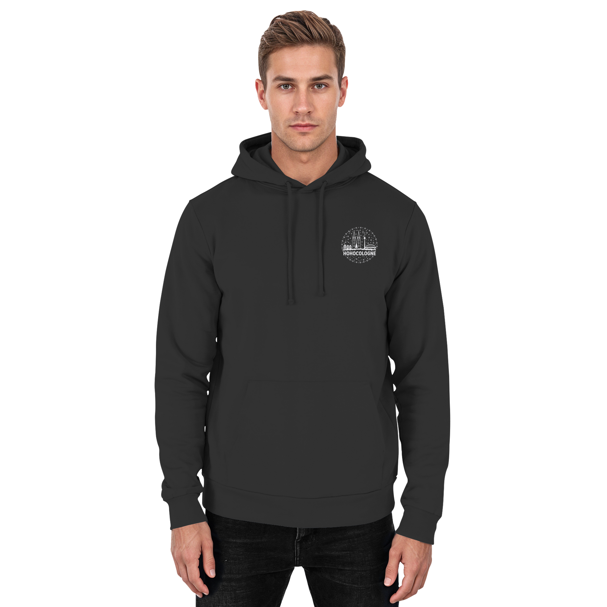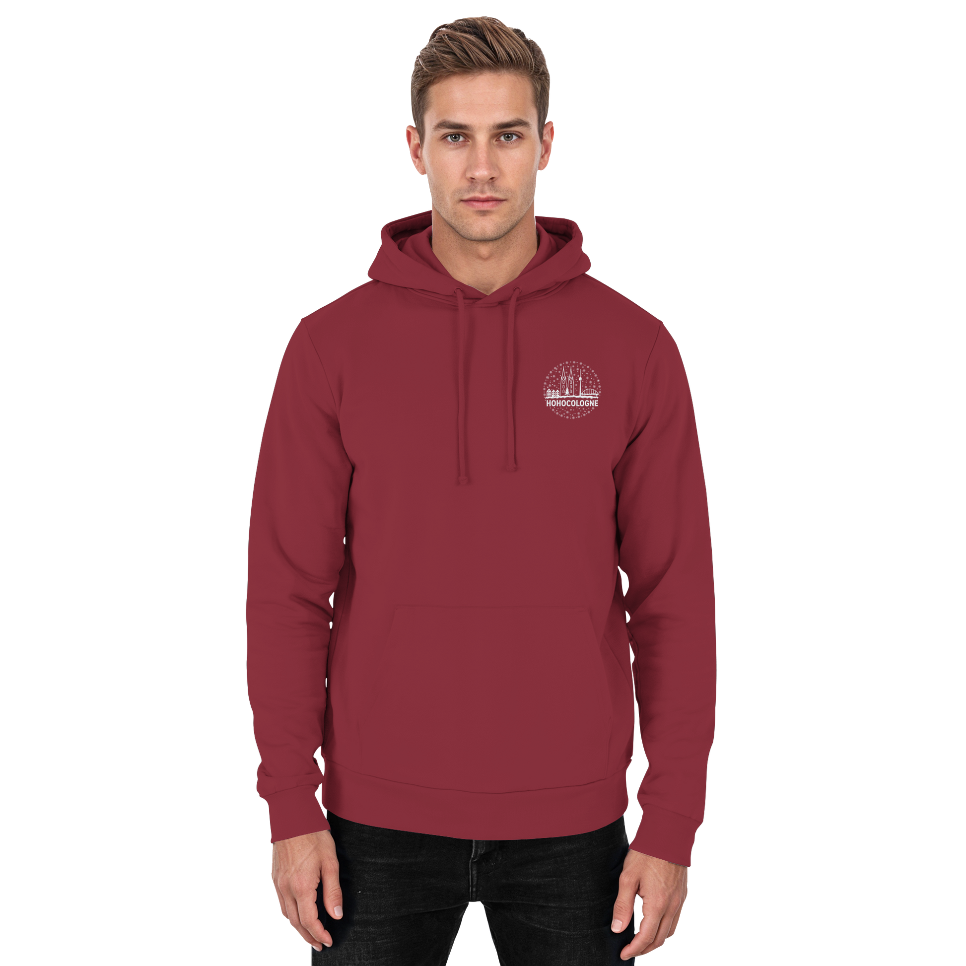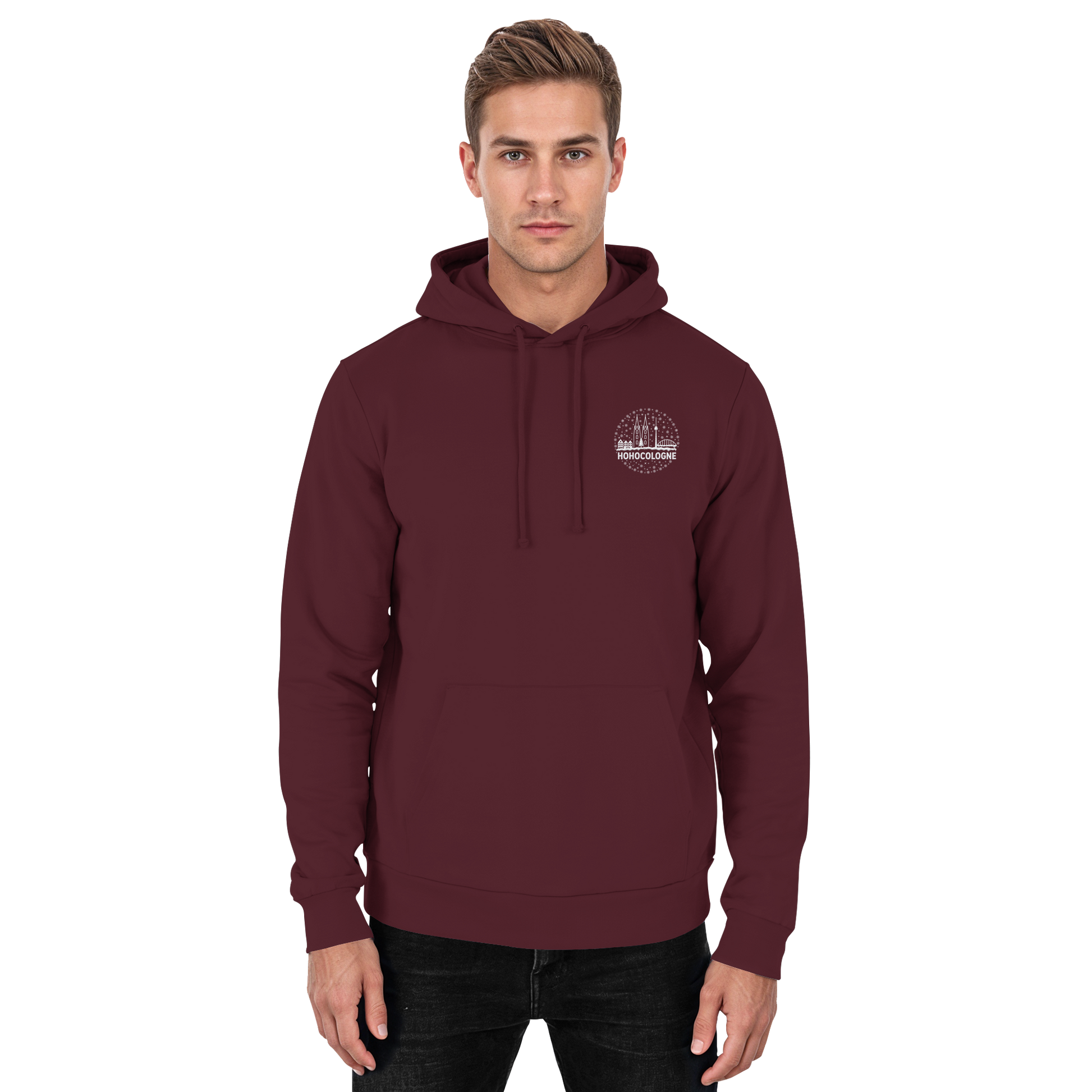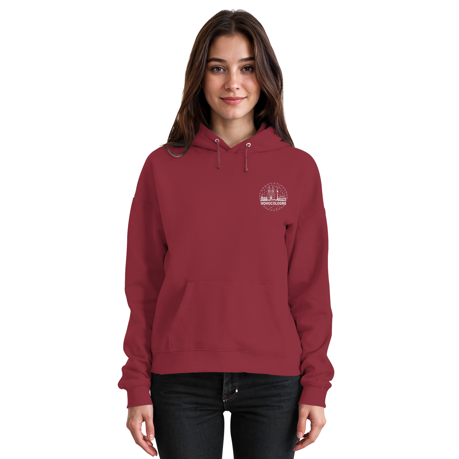 Das aufwendig weiß gestickte Motiv zeigt die Kölner Skyline mit Dom, Brücke und Fernsehturm – dazu Schneeflocken, ein Weihnachtsbaum und der Schriftzug HoHoCologne. Dezent festlich, klar im Design und typisch kölsch. Der Hoodie ist hochwertig verarbeitet und sitzt angenehm.