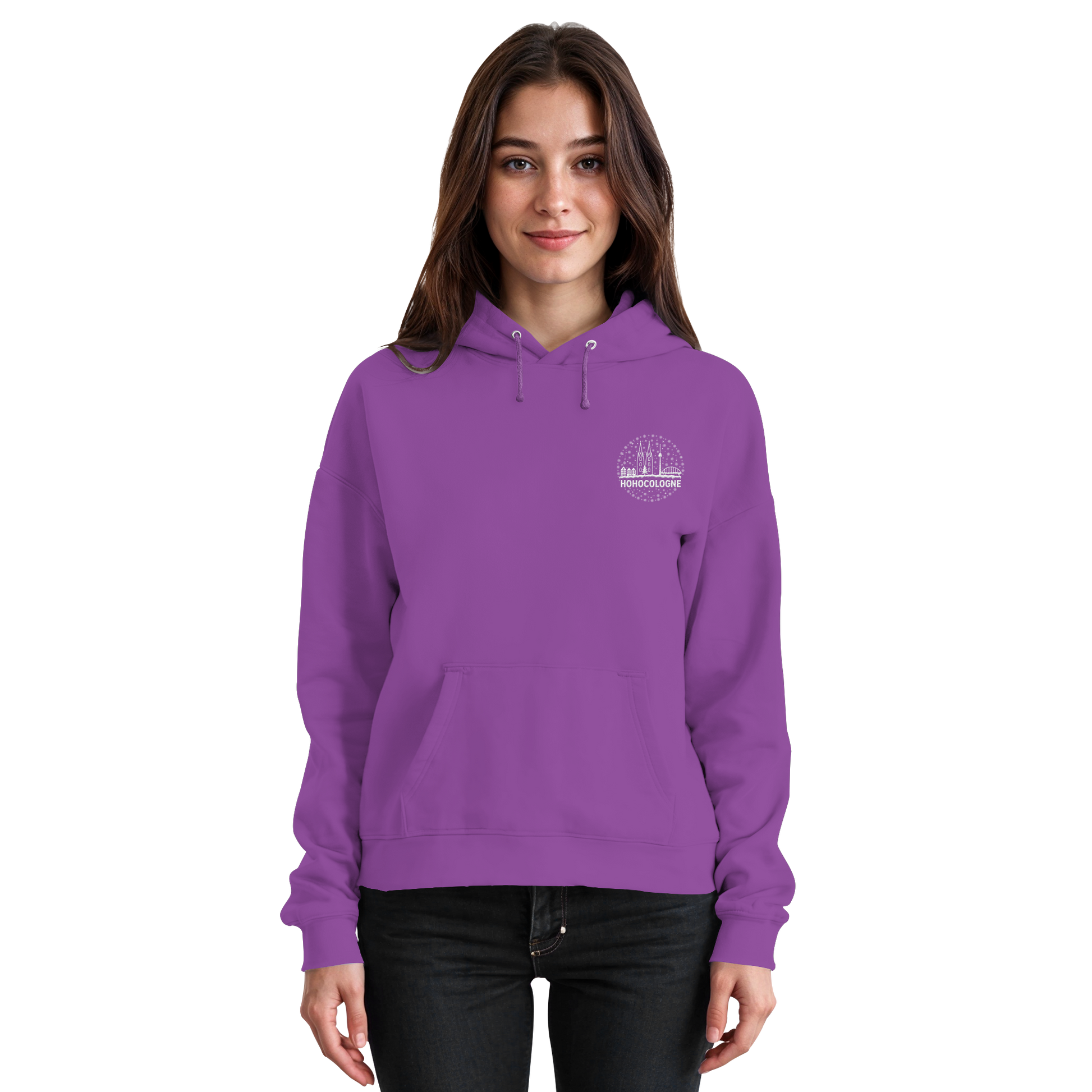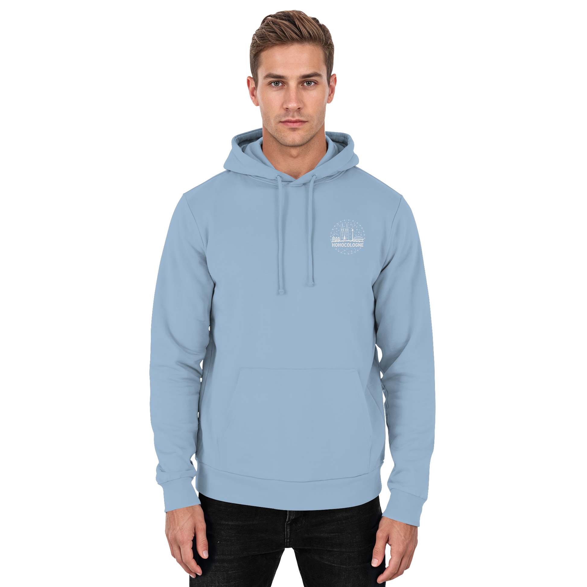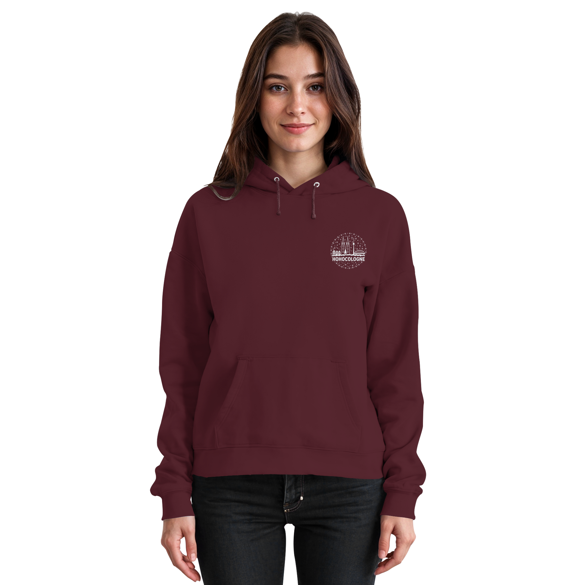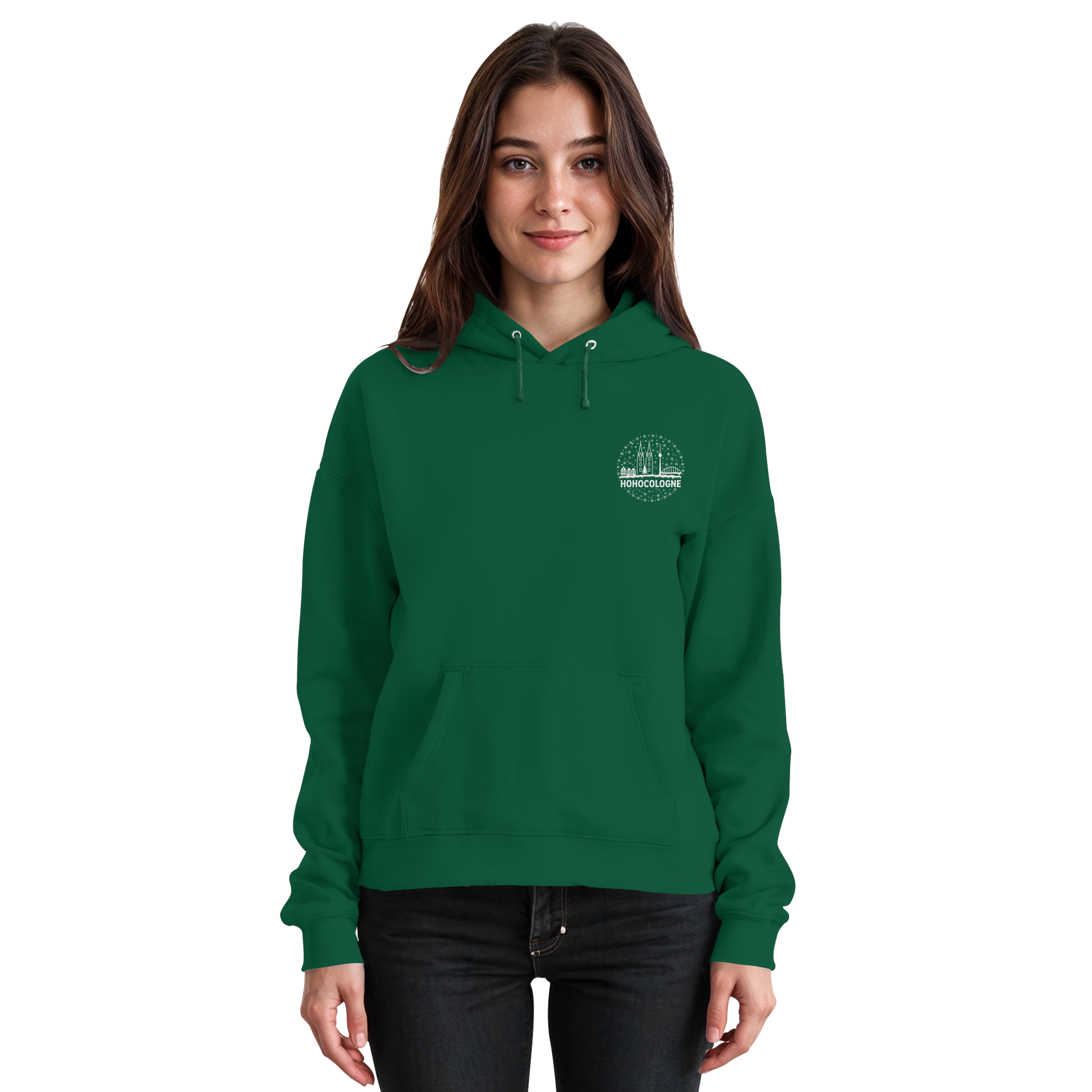 Das aufwendig weiß gestickte Motiv zeigt die Kölner Skyline mit Dom, Brücke und Fernsehturm – dazu Schneeflocken, ein Weihnachtsbaum und der Schriftzug HoHoCologne. Dezent festlich, klar im Design und typisch kölsch. Der Hoodie ist hochwertig verarbeitet und sitzt angenehm.