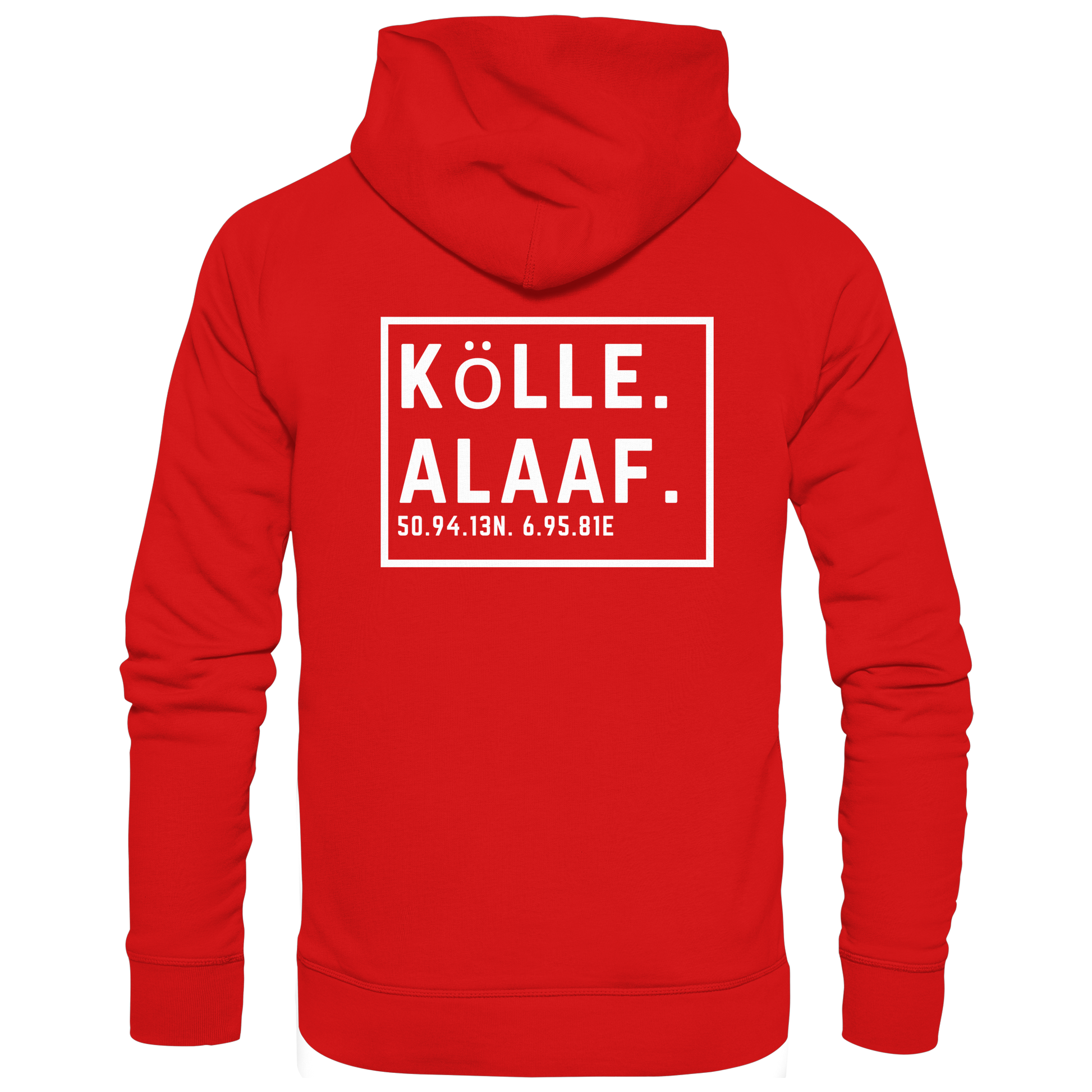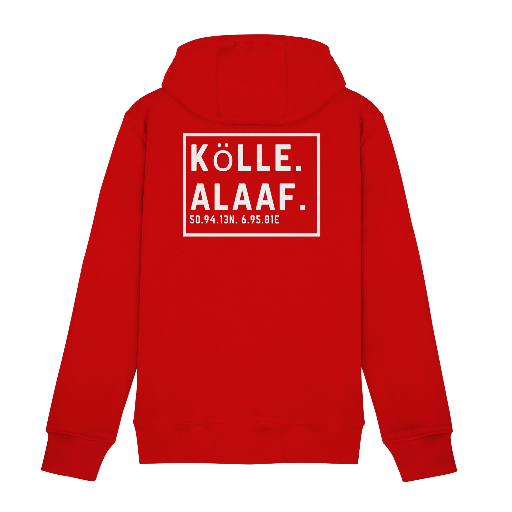 Der Stadtname verortet, die Koordinaten machen es persönlich und „Alaaf.“ sagt genau das, was jede Jeckin und jeder Jeck sofort versteht.
