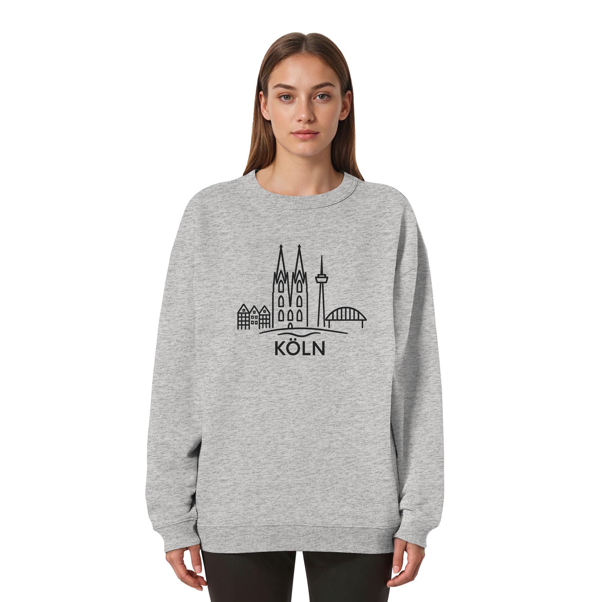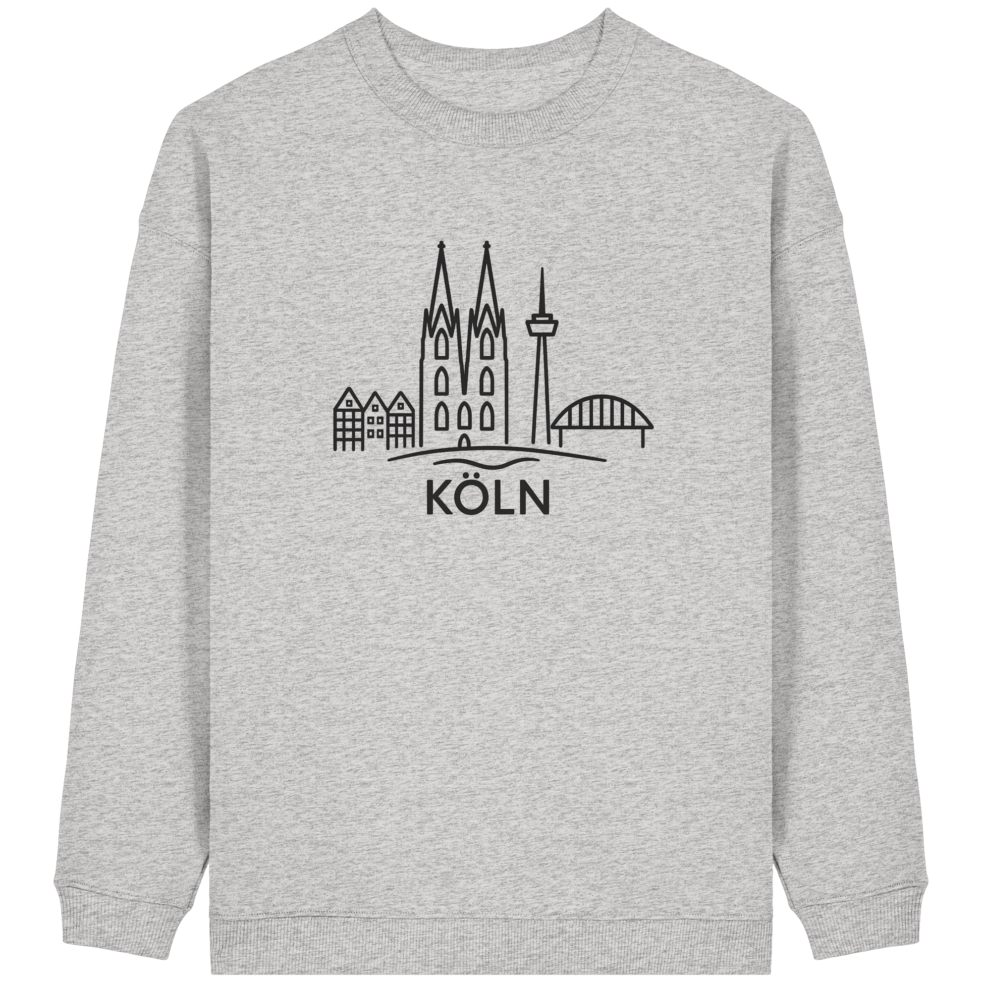 Der großflächige schwarze Druck zeigt die ikonische Skyline mit Dom, Brücke und Colonius – klar, modern und trotzdem voller kölscher Identität. Perfekt für kühle Abende am Rhein, den Bummel durch die Stadt oder entspannte Tage zuhause – ein Outfit, das überall passt, wo Köln im Herzen ist.
