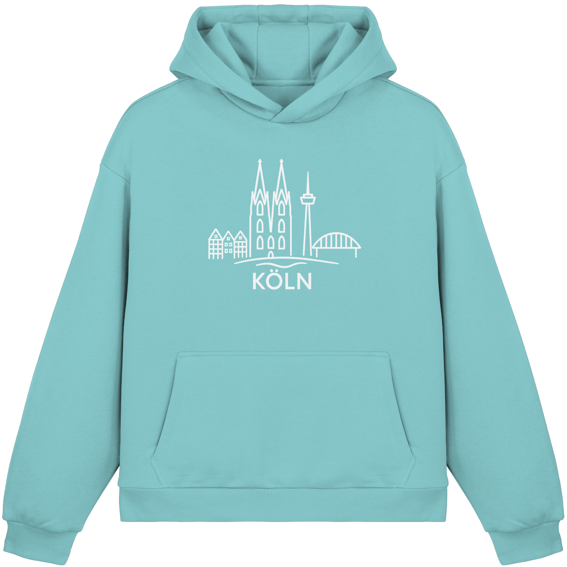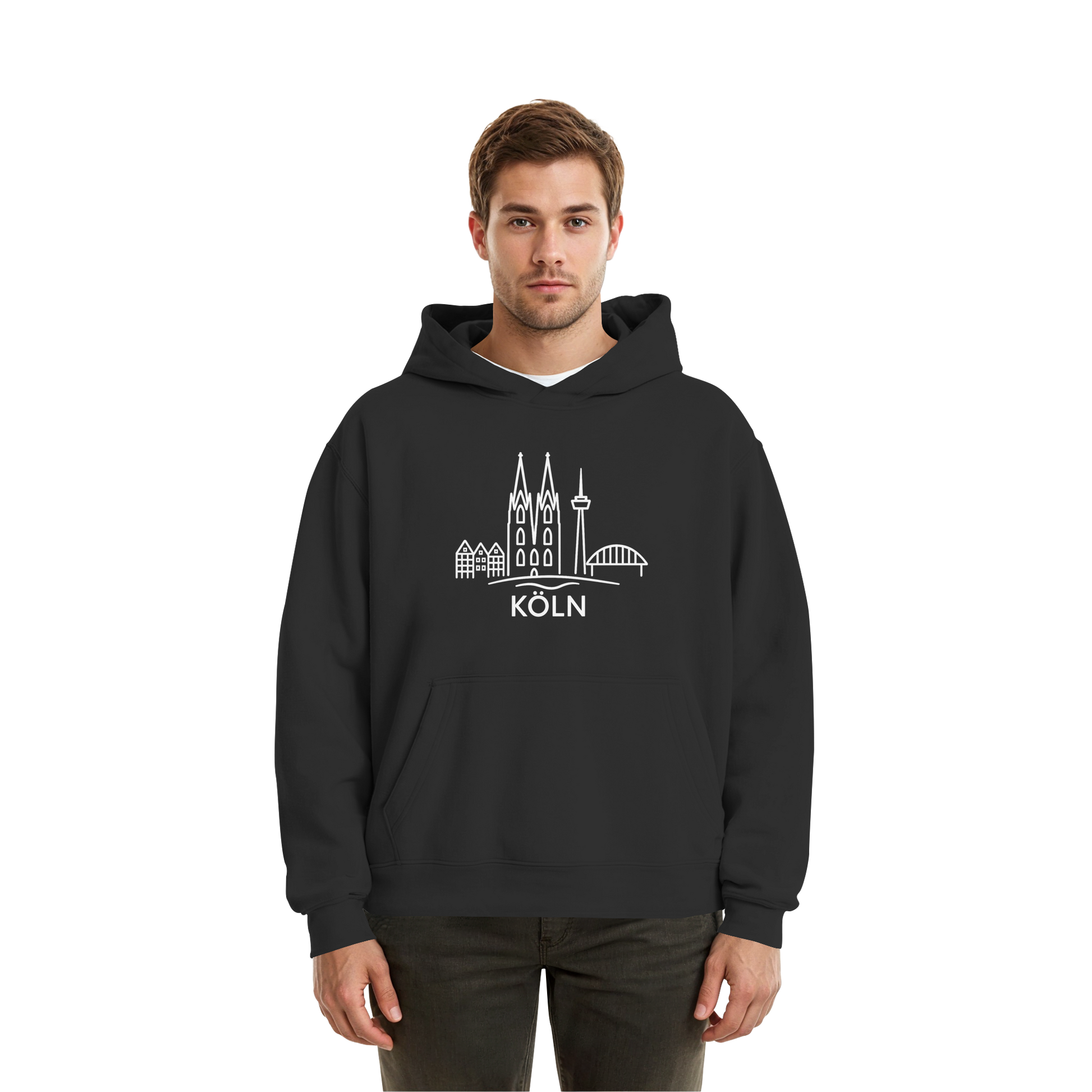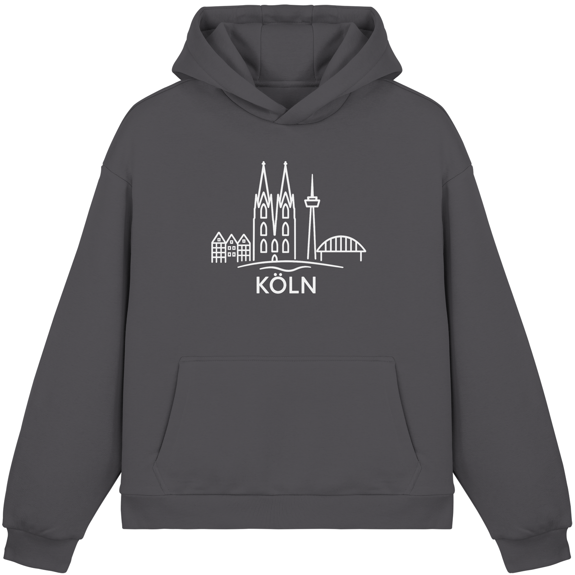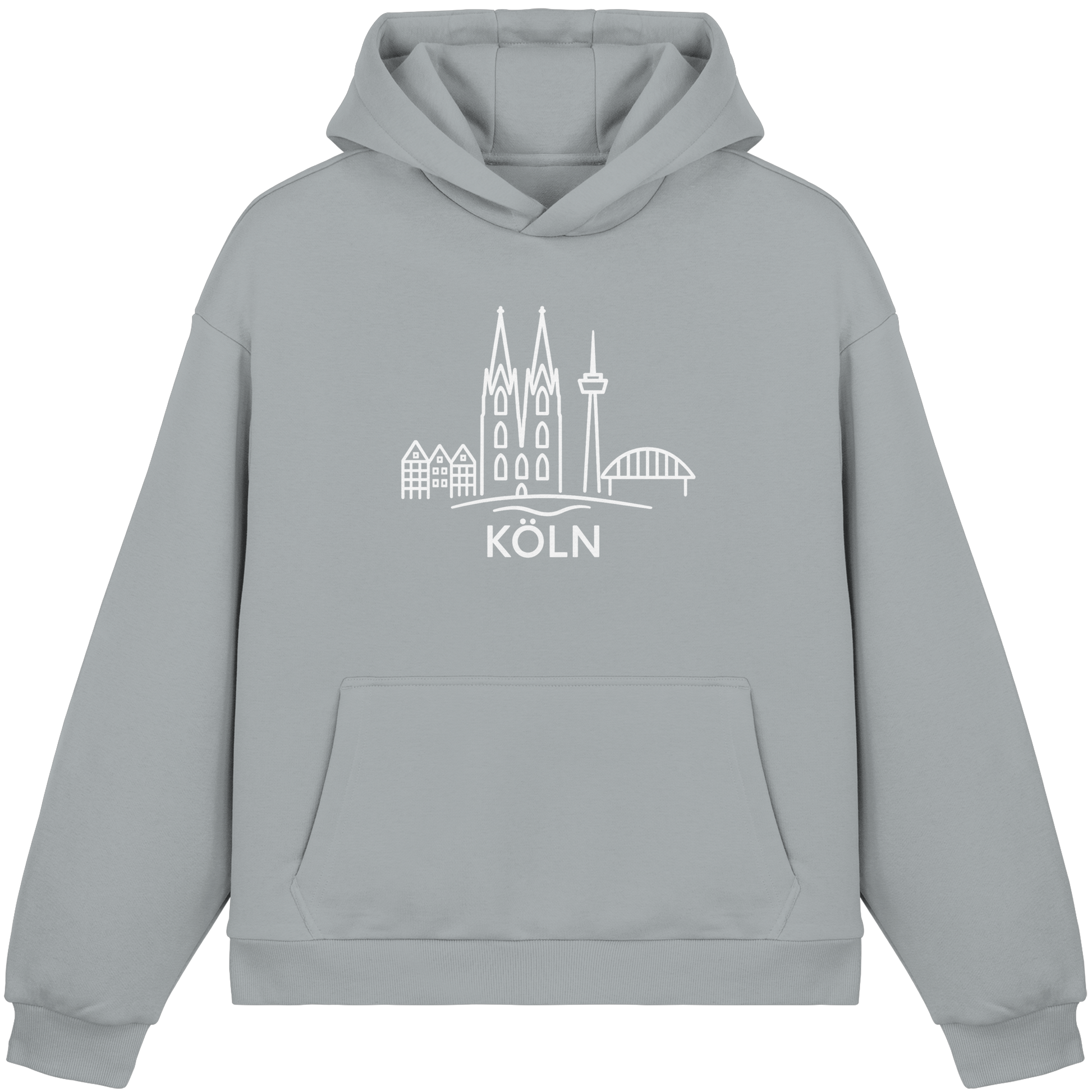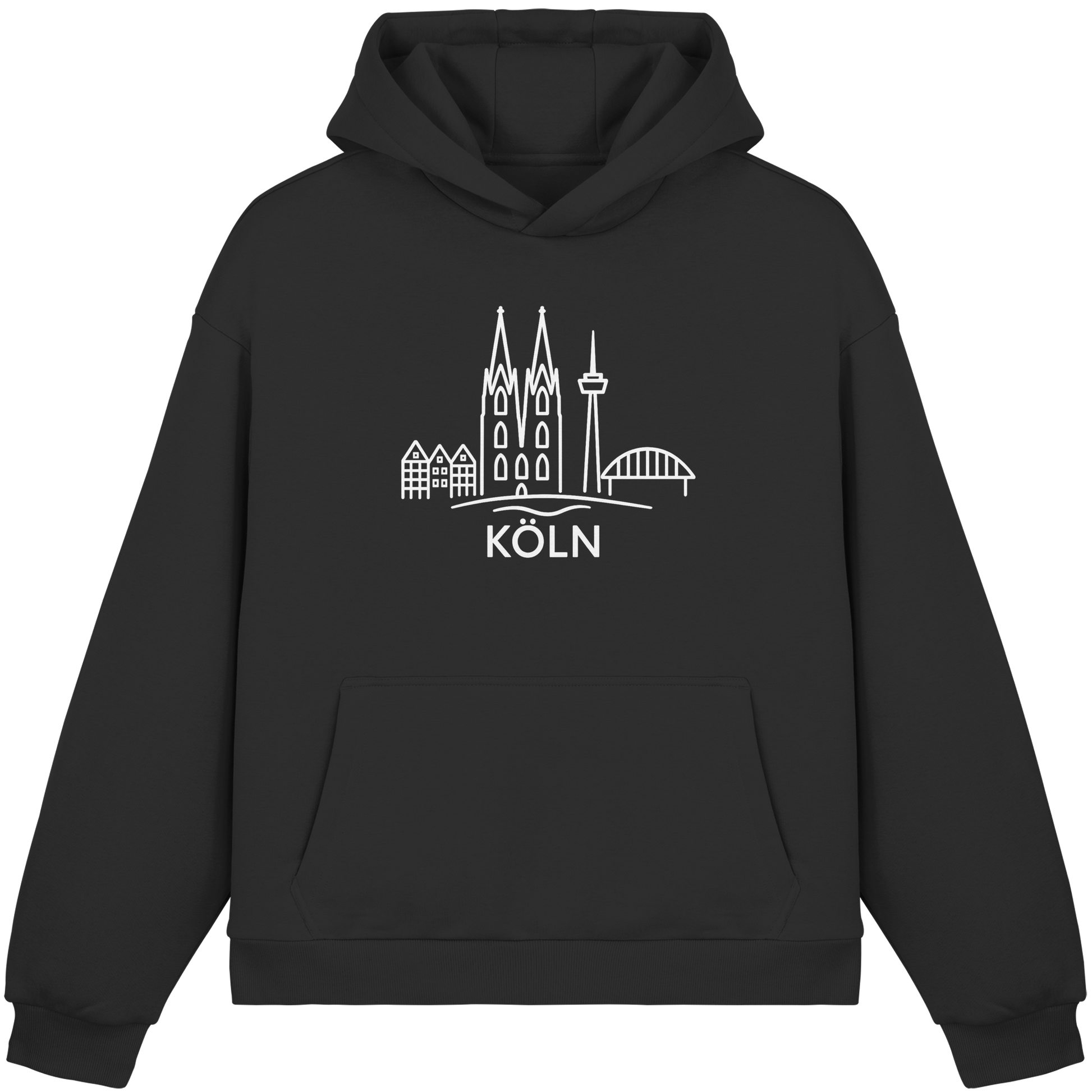 Der großflächige weiße Druck zeigt die ikonische Skyline mit Dom, Brücke und Colonius – klar, modern und trotzdem voller kölscher Identität. Perfekt für kühle Abende am Rhein, den Bummel durch die Stadt oder entspannte Tage zuhause – ein Outfit, das überall passt, wo Köln im Herzen ist.