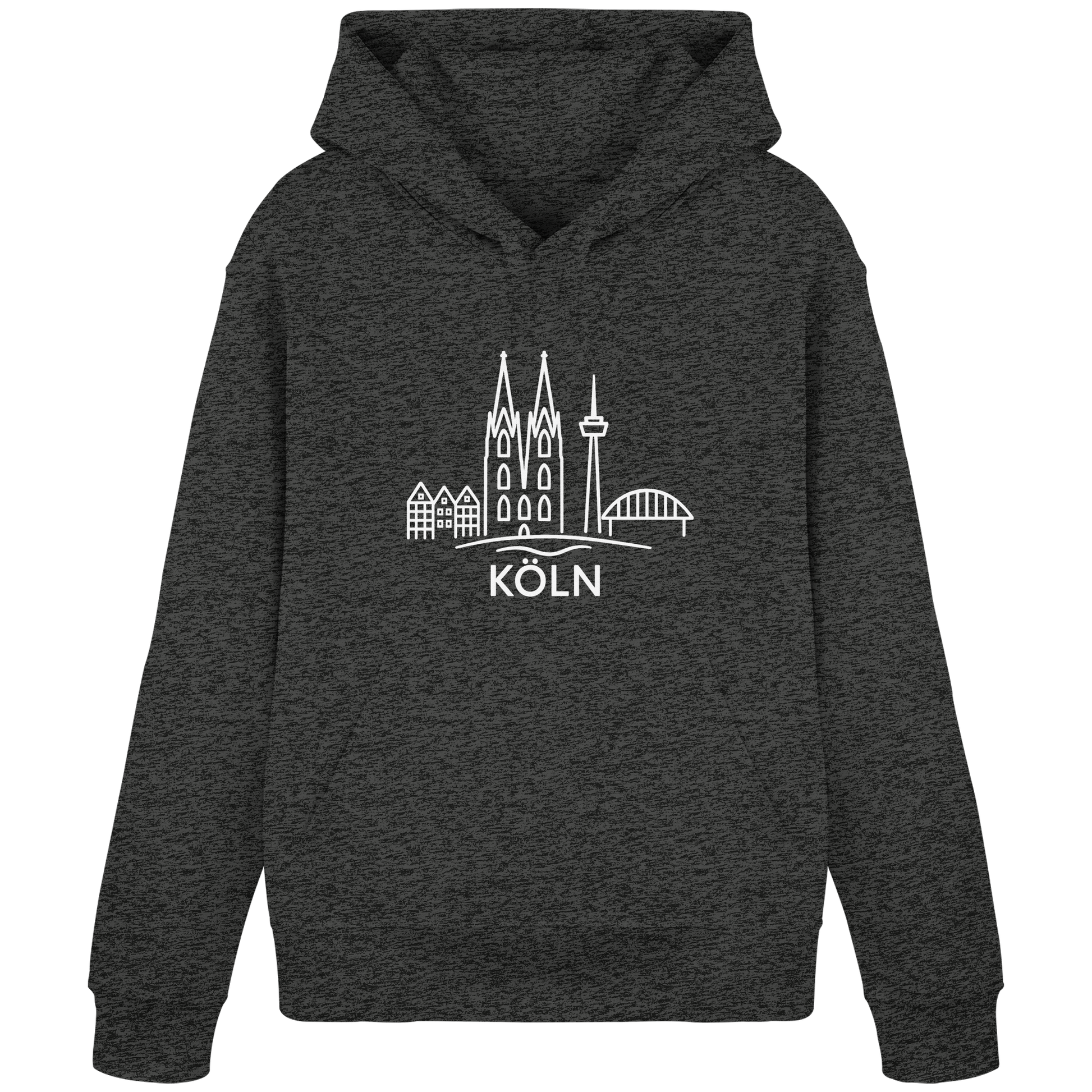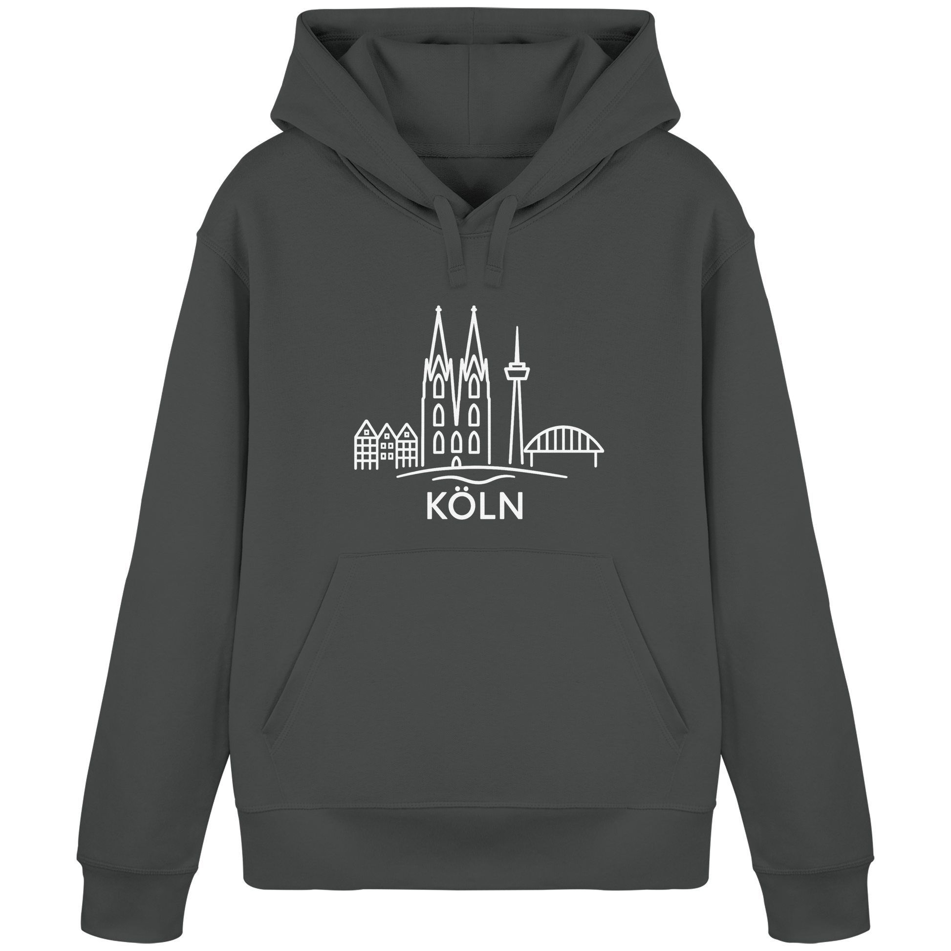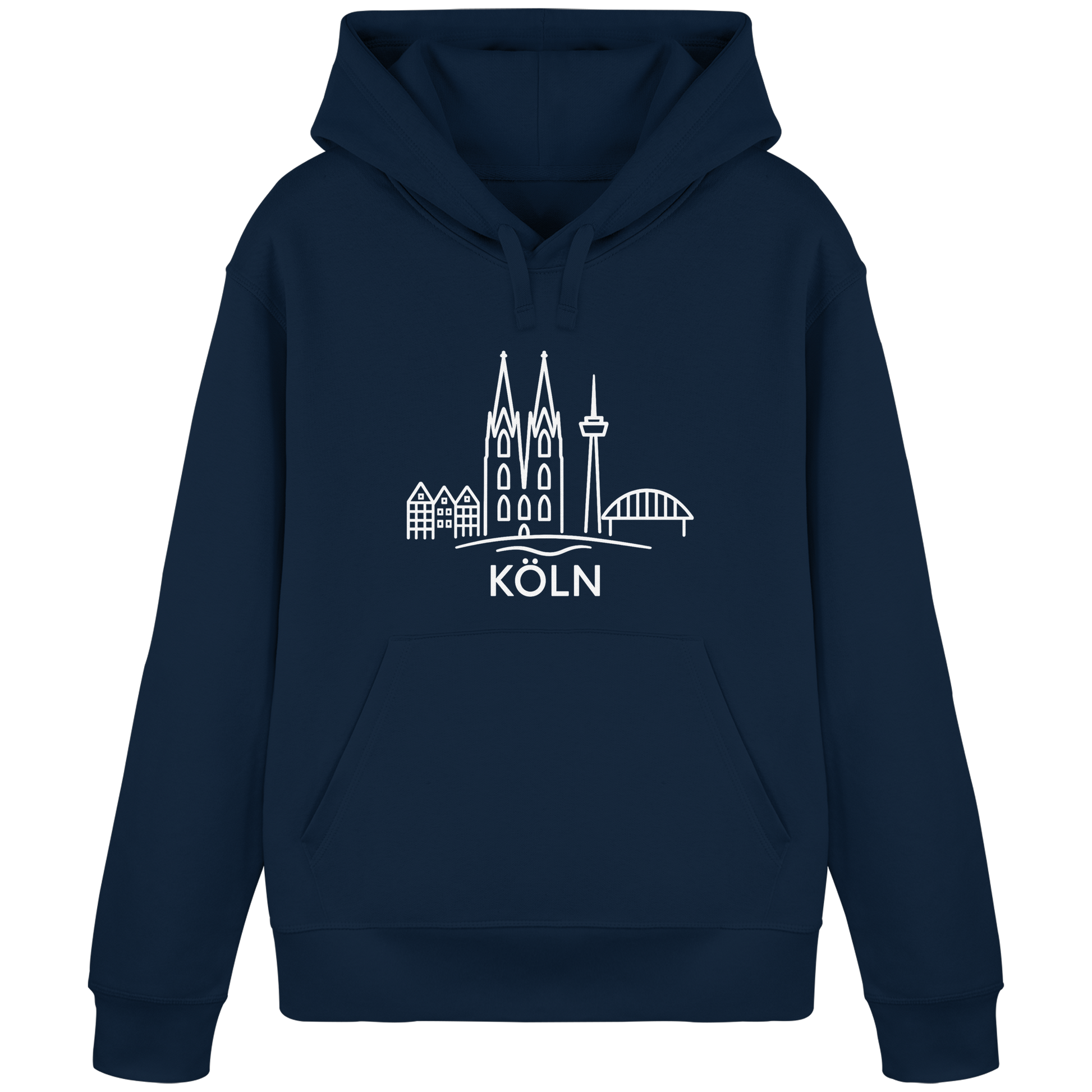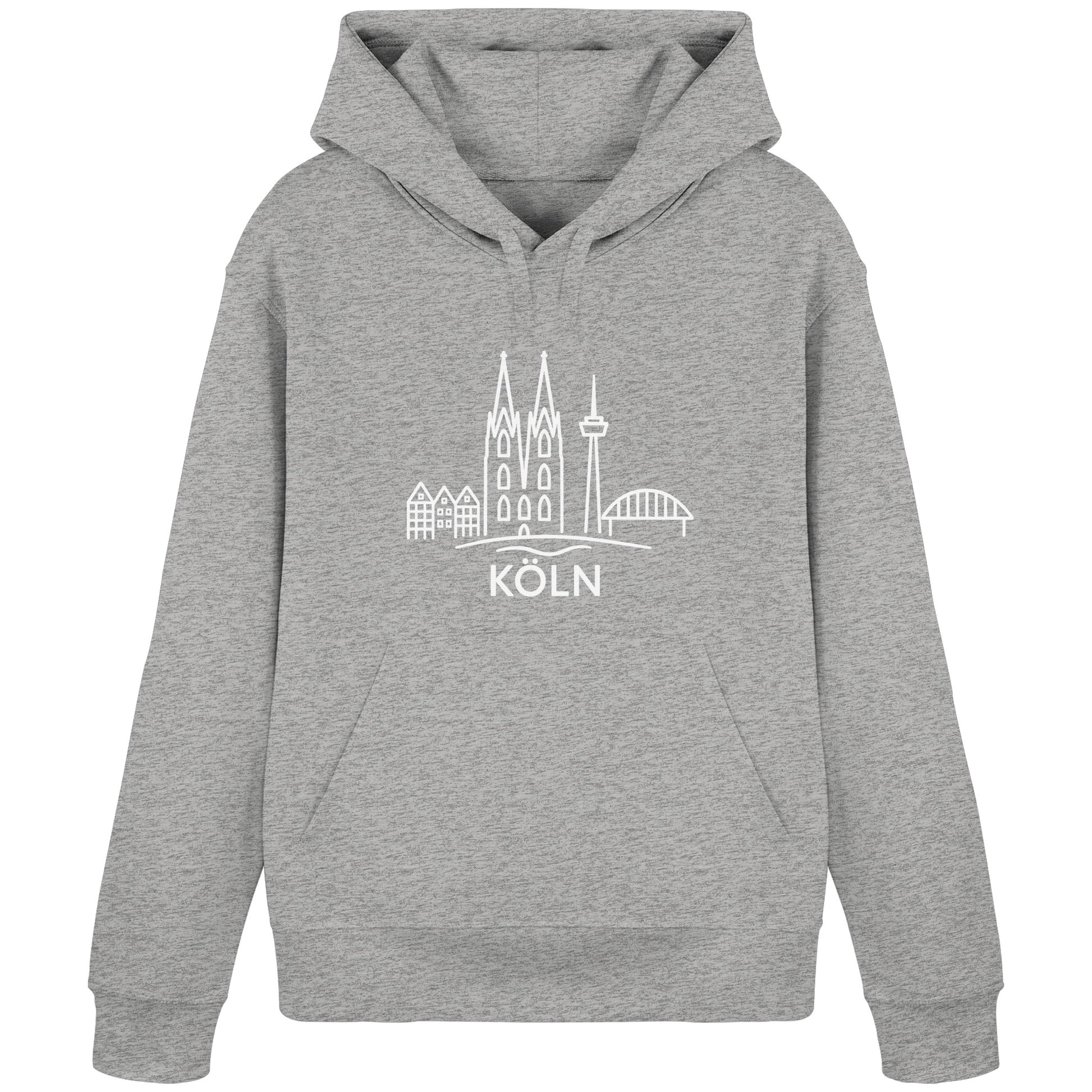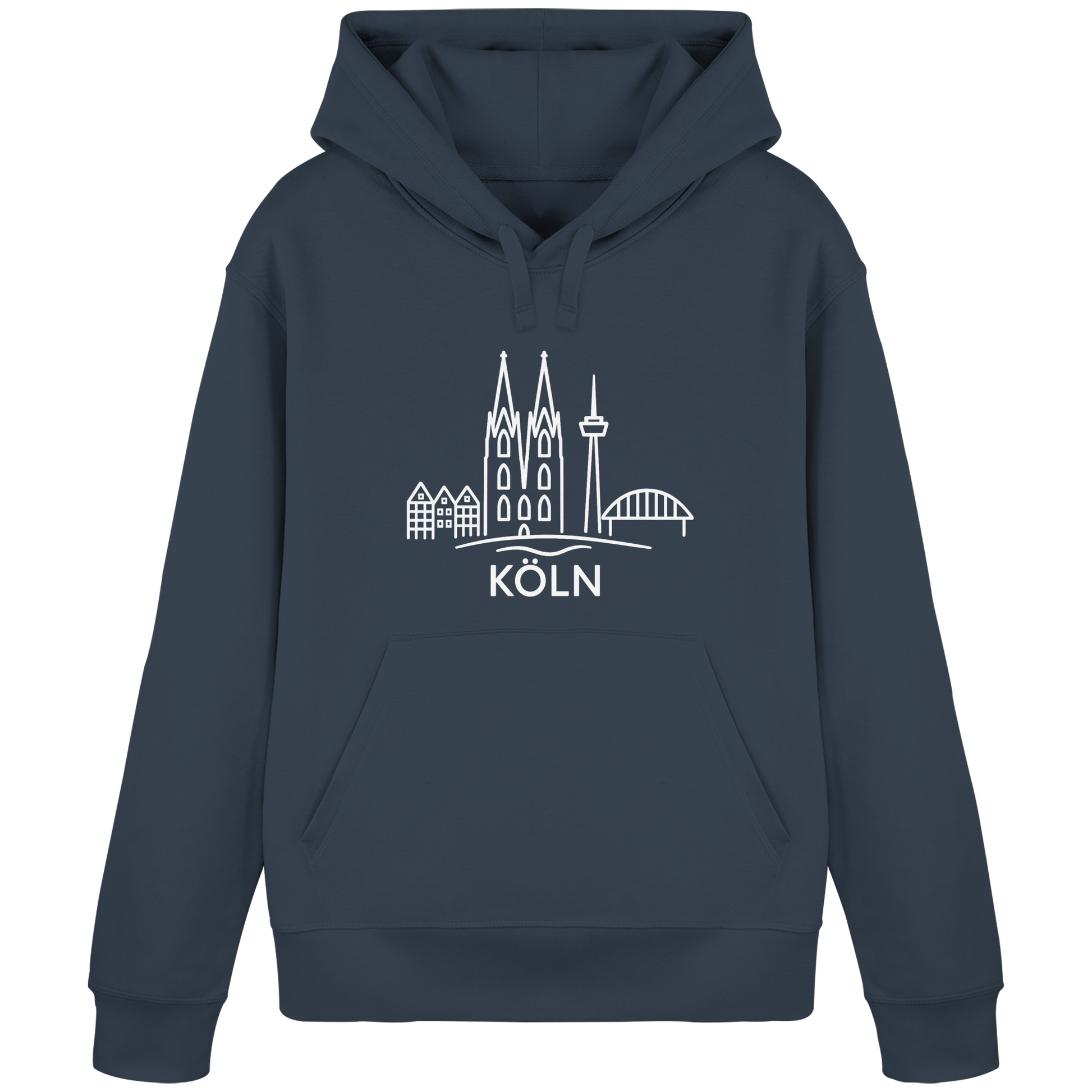 Der großflächige weiße Druck zeigt die ikonische Skyline mit Dom, Brücke und Colonius – klar, modern und trotzdem voller kölscher Identität. Perfekt für kühle Abende am Rhein, den Bummel durch die Stadt oder entspannte Tage zuhause – ein Outfit, das überall passt, wo Köln im Herzen ist.