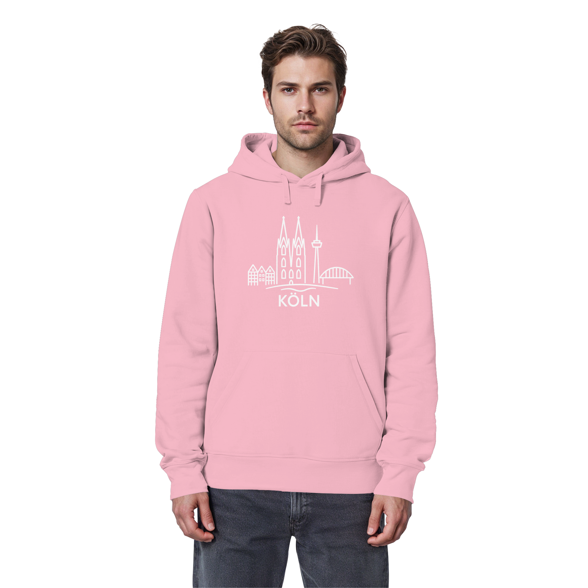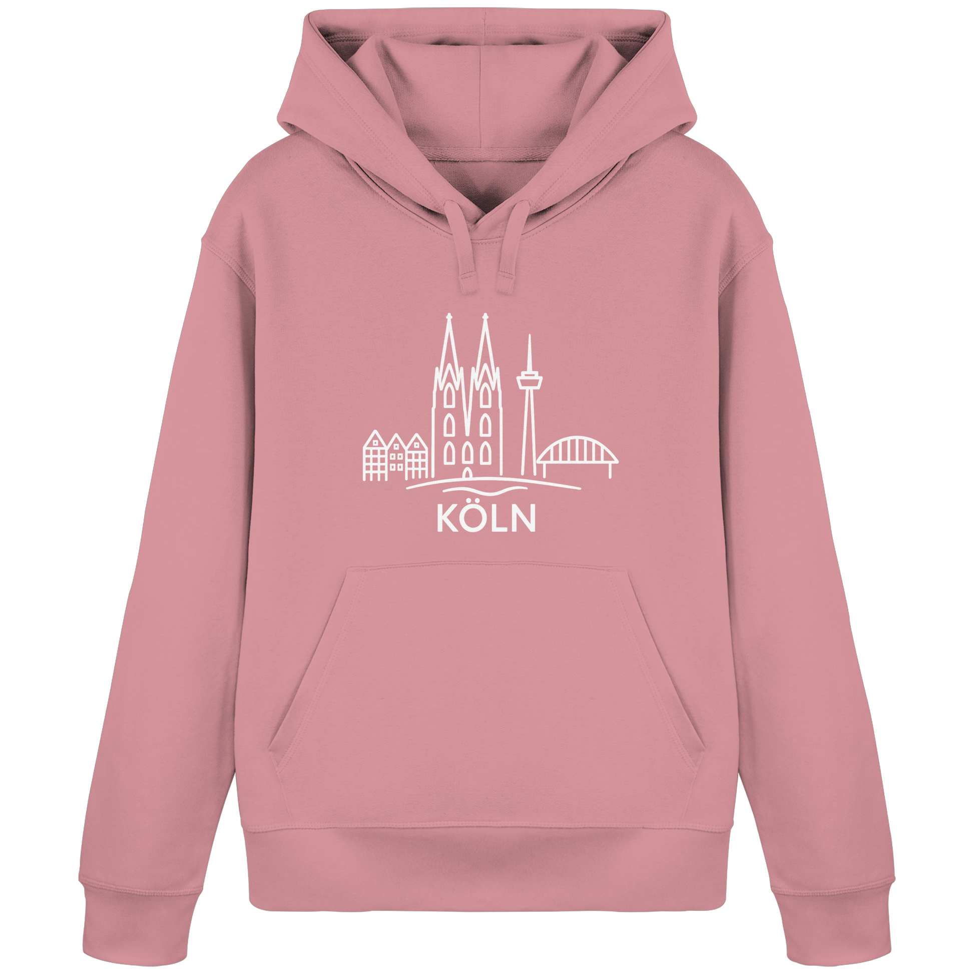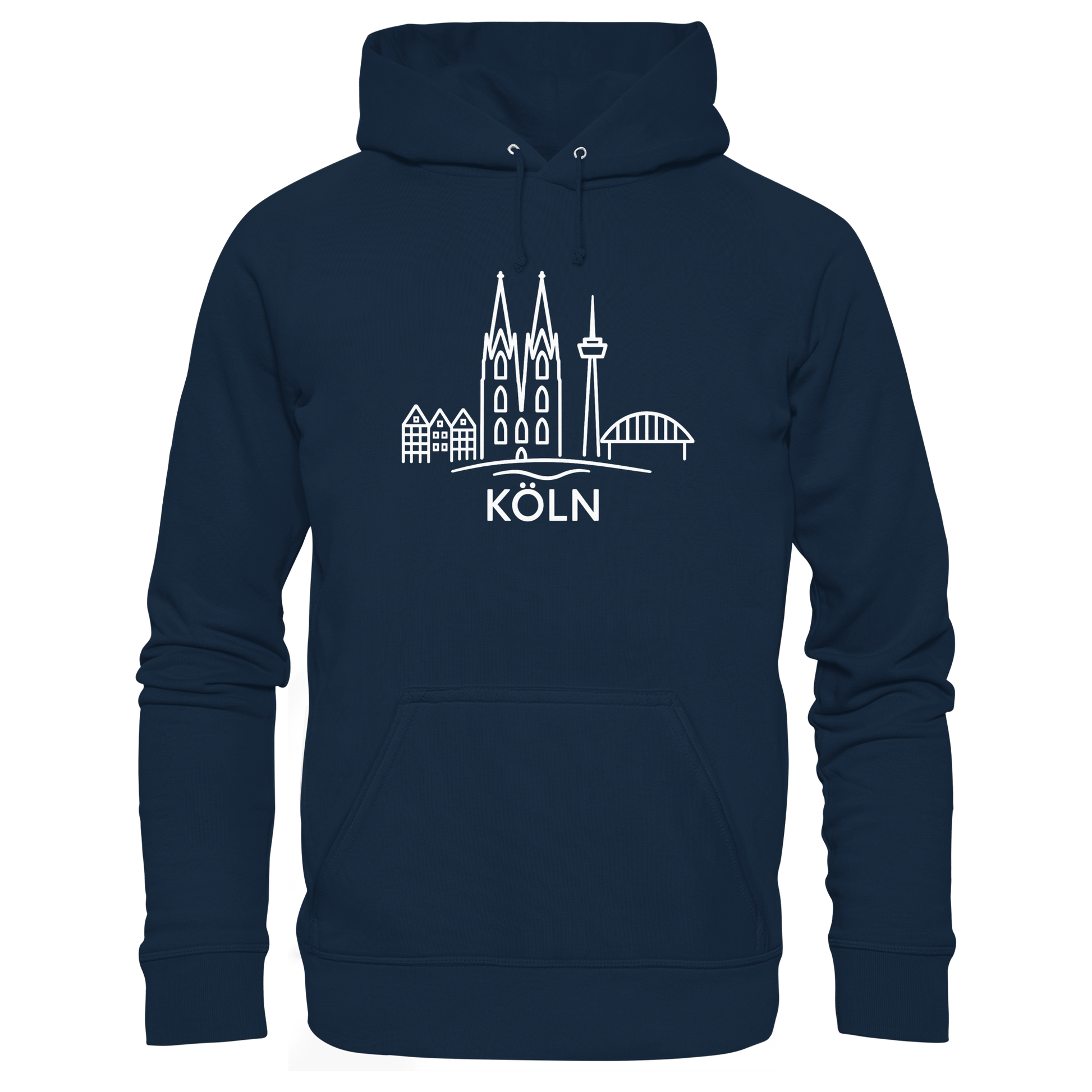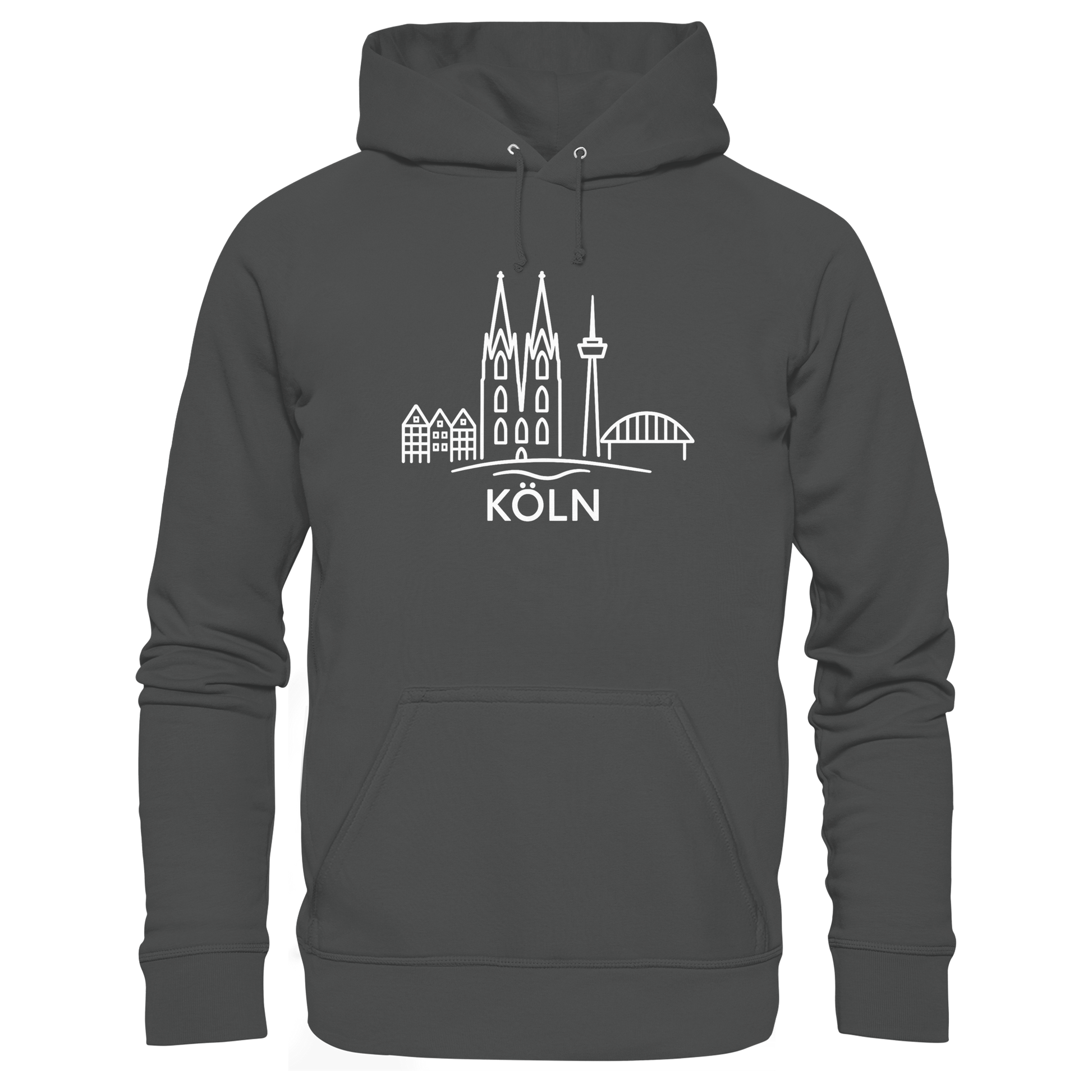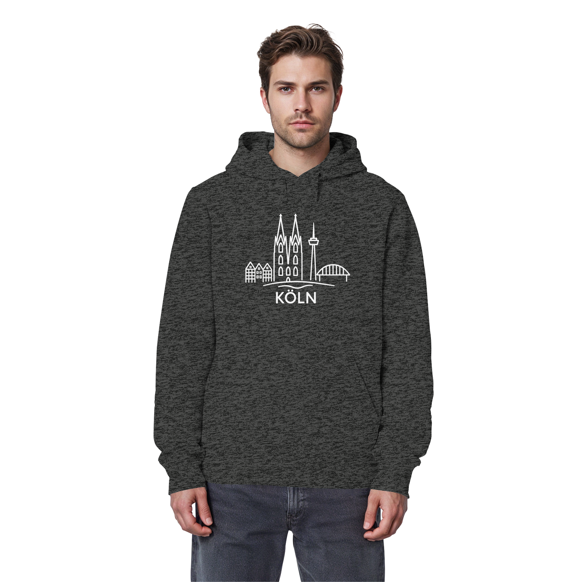 Der großflächige weiße Druck zeigt die ikonische Skyline mit Dom, Brücke und Colonius – klar, modern und trotzdem voller kölscher Identität. Perfekt für kühle Abende am Rhein, den Bummel durch die Stadt oder entspannte Tage zuhause – ein Outfit, das überall passt, wo Köln im Herzen ist.